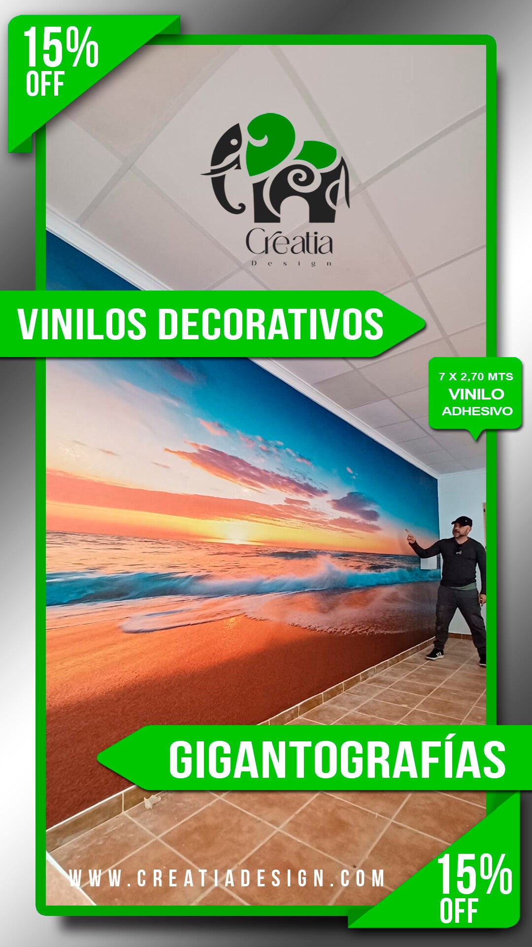 En Creatia Design, nos especializamos en darle un toque mágico a tus paredes y transformar por completo la decoración de tu hogar o negocio. Utilizamos materiales de alta calidad como vinilos adhesivos y lonas plásticas para garantizar un resultado impecable. Y lo mejor de todo, ¡ahora estamos ofreciendo un 15% de descuento en todos tus pedidos! ✨🏡 #DecoraciónDeInteriores #VinilosAdhesivos #LonasPlásticas #DescuentoEspecial #CalidadGarantizada